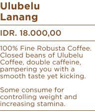 Closed beans of Ulubelu Coffee, double caffeine, pampering you with a smooth taste yet kicking. Some consume for controlling weight and increasing stamina.